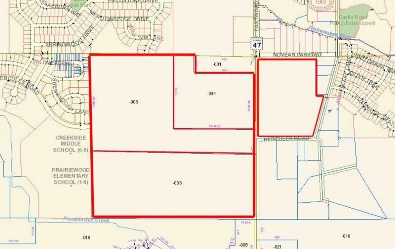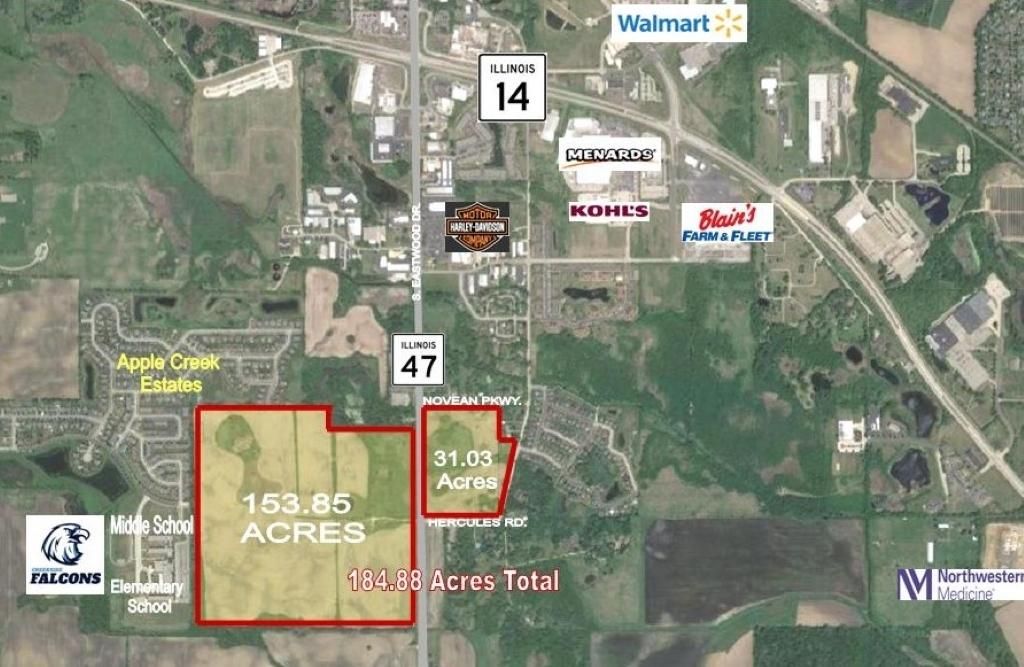DEVELOPMENT LAND 184.88 ACRES 184.88 Acres along Route 47, just south of Route 14 in unincorporated Woodstock and north of I-90 Route 47 Interchange. Currently zoned AG in McHenry County with daily traffic counts of 15,400 vpd. Approximately 30 AC of wetlands between the parcels. 153.85 acres on the west side of Route 47 with 1,311' frontage, ideal for commercial or residential development. Just west of this parcel is Woodstock's Prairiewood Elementary School and Creekside Middle School. Hercules Road can connect from the east side of Route 47 to the west side at the schools. The remaining 31.03 acres are on the northeast corner of Route 47 and Hercules Road with 963' frontage. Ideally located minutes from shopping in either Woodstock or Huntley (south of site) and just east of Northwestern Hospital. Owner may be open to divisibility with pricing per acre to be determined.See attached rendering of potential mixed use plan.
