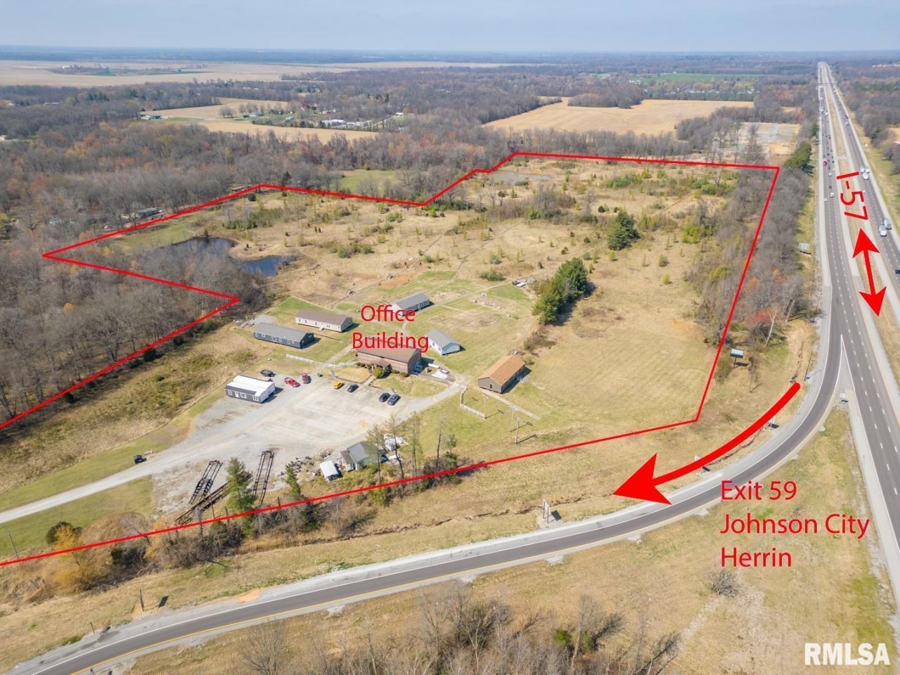 Large two-story Commercial building with full walkout basement and large second story deck on the back of the building. This former golf course clubhouse and bar has 2,500 sq. ft. of office space. 5,148 sq. ft. of total space, plus an unfinished 2,592 sq. ft. basement Located at the Northwest corner of the I-57 of exit 59 Johnston City. Just five minutes north of Marion, IL exits. Over 40,000 cars a day on six lanes of the I-57. TIF incentives available, all city utilities available. Zoned B-2 Primary Business District now, but it could be changed. Located at the Official exit off I-57 for the Walker's Bluff Casino & convention center located approximately 20 minutes west of this exchange. Excellent location for a truck stop, hotel, restaurant, or strip mall. 660 feet of I-57 frontage available. An additional forty-one acres are available for sale or lease. Will divide and sell or lease the ground.