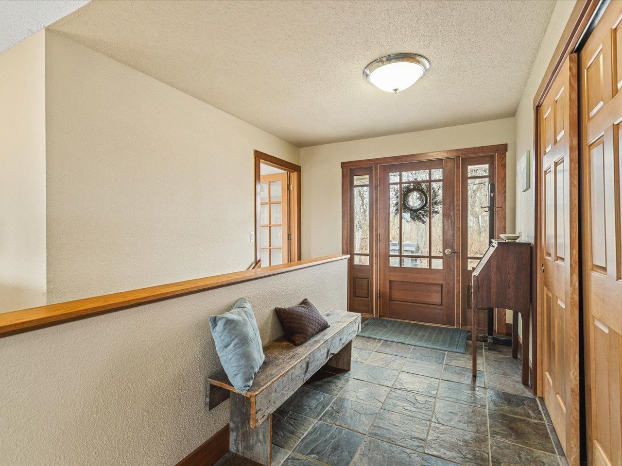 Nearly 10 ACRES of wooded privacy surround this spacious 2,400 sq ft home, offering the perfect blend of comfort and nature. The main level features beautiful HICKORY, MAPLE, and CHERRY wood flooring throughout, creating warmth and character in every room. The expansive kitchen is a standout with abundant CUSTOM, KRAFTMAID, CHERRY CABINETRY and plenty of space for cooking and gathering. It opens to a bright living and dining area with vaulted ceilings and walls of windows, bringing in natural light and showcasing peaceful views of the surrounding landscape. A large foyer with slate floors provides a beautiful entry into the home. Enjoy the comfort of RADIANT FLOOR HEATING on both the main and lower levels. The FULL, UNFINISHED, WALK-OUT LOWER LEVEL features 9-foot ceilings, a half bath (roughed in for a full bath), and is roughed in for a second kitchen, offering excellent potential for additional living space, guest quarters, or entertaining. The large primary suite includes a jetted tub, step-in shower, dual sinks, and a generous walk-in closet. A main floor laundry room adds everyday convenience. Outside, the property truly shines with mature woods, Concord grapevines, and abundant wildlife, including deer and turkey-perfect for those who appreciate nature and privacy. The home also features a maintenance-free steel roof, NEW cooktop (2025), and new dishwasher (2023). If you're looking for space, privacy, and a peaceful country setting, this property offers it all.
