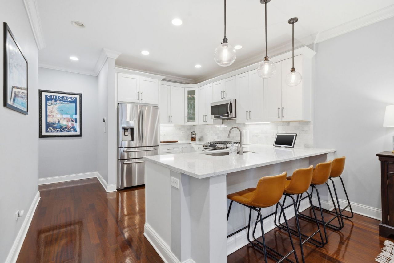 Located in the heart of Lakeview's highly desirable Southport Corridor, this extra-wide 2 bed / 2 bath condo stands out with two private outdoor spaces and exterior parking included. The wide floor plan offers larger room sizes and an open, comfortable flow with hardwood floors throughout, crown molding, and a spacious living area with fireplace plus room for dining. The kitchen is finished with white shaker cabinetry, quartz countertops, marble backsplash, and ample storage. The generous primary suite features a walk-in closet and oversized bathroom with double vanity, soaking tub, heated floors and separate steam shower. Enjoy outdoor living from the full-width front terrace or the rear deck off the primary suite. Unbeatable location just steps to Whole Foods Market, Target, Southport's shops and restaurants, parks, and easy transit access.