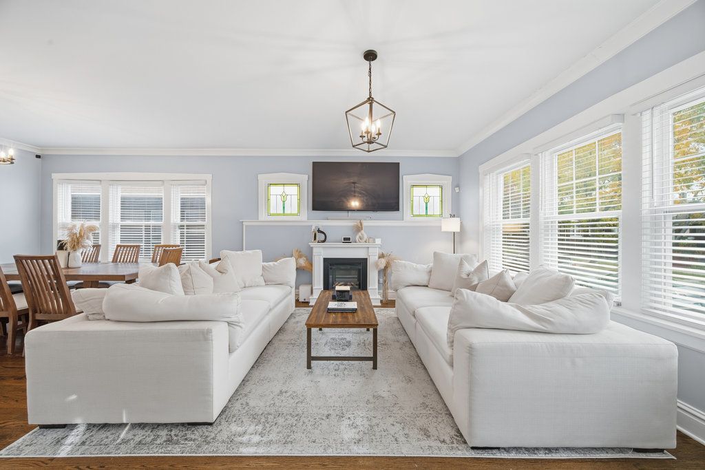 Beautifully Maintained 5-Bedroom Brick Bungalow with Modern Upgrades and Spacious Yard Welcome home to this beautifully updated 5-bedroom, 2-bathroom brick bungalow offering timeless charm with modern comfort. Situated on a full basement, this home features hardwood flooring throughout and an inviting layout perfect for both everyday living and entertaining. Step into a bright and airy living room filled with natural light, detailed with crown molding. The open-concept dining area flows seamlessly into a stunning kitchen featuring white cabinetry, tile backsplash, granite countertops, stainless-steel appliances, and a walk-in pantry-ideal for any home chef. The main level includes two bedrooms and a full tile bathroom. Upstairs, you'll find three bedrooms and a beautifully updated bath with a walk-in shower. The full basement offers endless possibilities-with a large laundry area and plenty of space for a game room, playroom, or media room. Outside, enjoy your level backyard surrounded by a privacy fence and complete with a spacious patio-perfect for relaxing or entertaining. A detached two-car garage provides added convenience and storage. This move-in ready home blends classic charm with modern style and functionality. Don't miss your opportunity to make it yours!