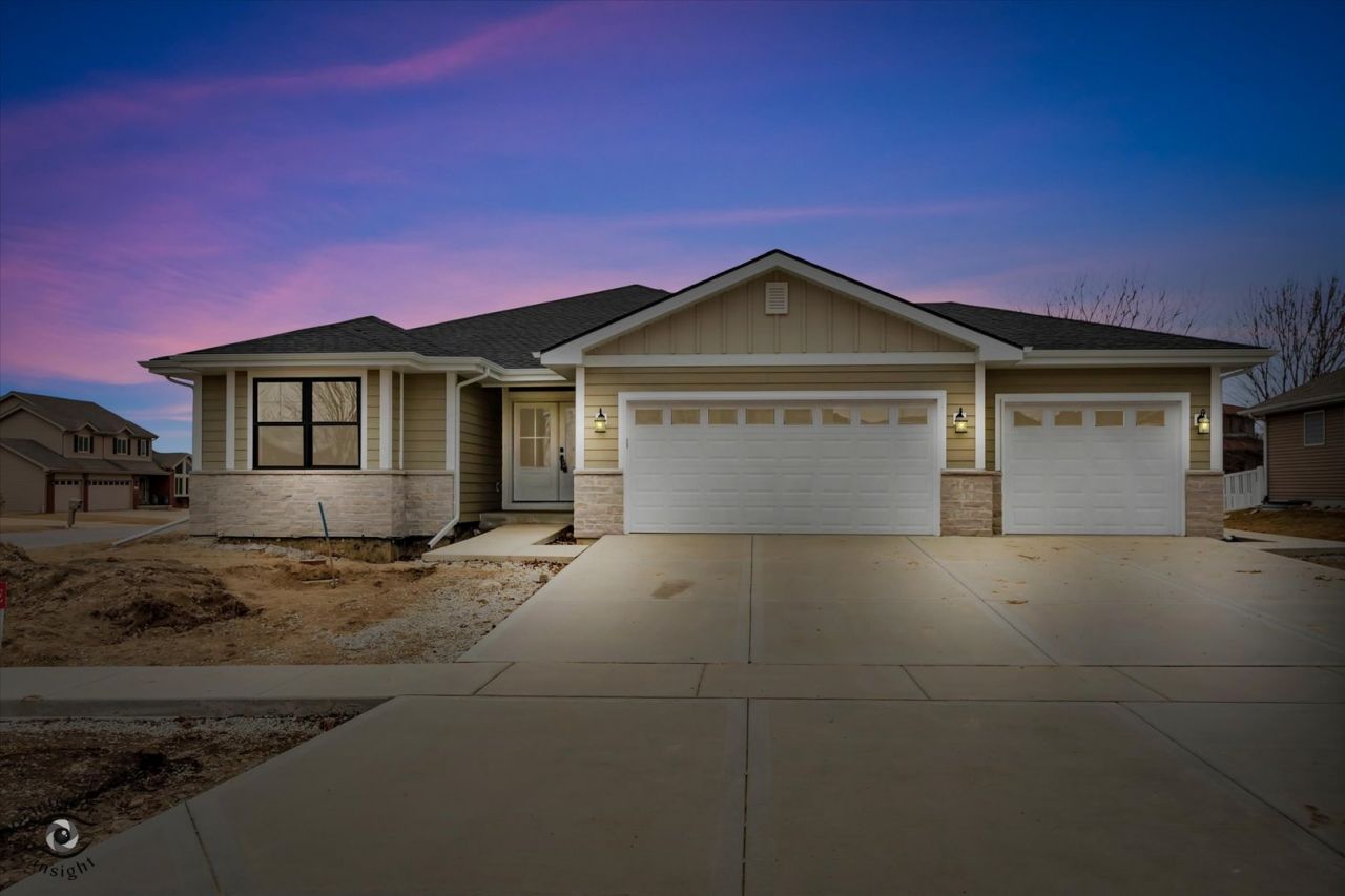 Discover the perfect blend of modern comfort and timeless ranch-style appeal in this stunning 3-bedroom, 2-bathroom home spanning 1,675 square feet of thoughtfully designed living space, complete with a full basement ready for your future expansion, recreation room, or storage needs. The moment you step inside, you're greeted by an inviting open floor plan that seamlessly connects the living, dining, and kitchen areas-ideal for effortless entertaining and everyday family life. The family room impresses with its dramatic cathedral ceiling and an abundance of large windows that flood the main living spaces with natural light, creating a bright, airy atmosphere throughout the day. Underfoot, beautiful Shaw engineered hardwood flooring flows through the main living areas, adding warmth and durability. The gourmet kitchen is a true highlight, featuring sleek white shaker-style cabinets with soft-close functionality, a striking dark grey island as the focal point, and elegant quartz countertops that offer both style and easy maintenance. Both bathrooms continue the premium theme with shaker-style stained-finish cabinets and white cultured marble surfaces for a clean, sophisticated look. Outside, the home boasts a handsome exterior combining natural stone accents with low-maintenance LP SmartSide siding for lasting curb appeal. It sits proudly on a spacious corner lot, providing extra privacy, room to play, and excellent visibility. The 3-car garage offers plenty of parking and storage, while the fully finished yard will feature fresh sod and professional landscaping to welcome you home in style. Please call to schedule your private showing today! Agent related.