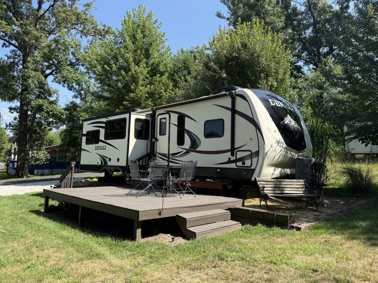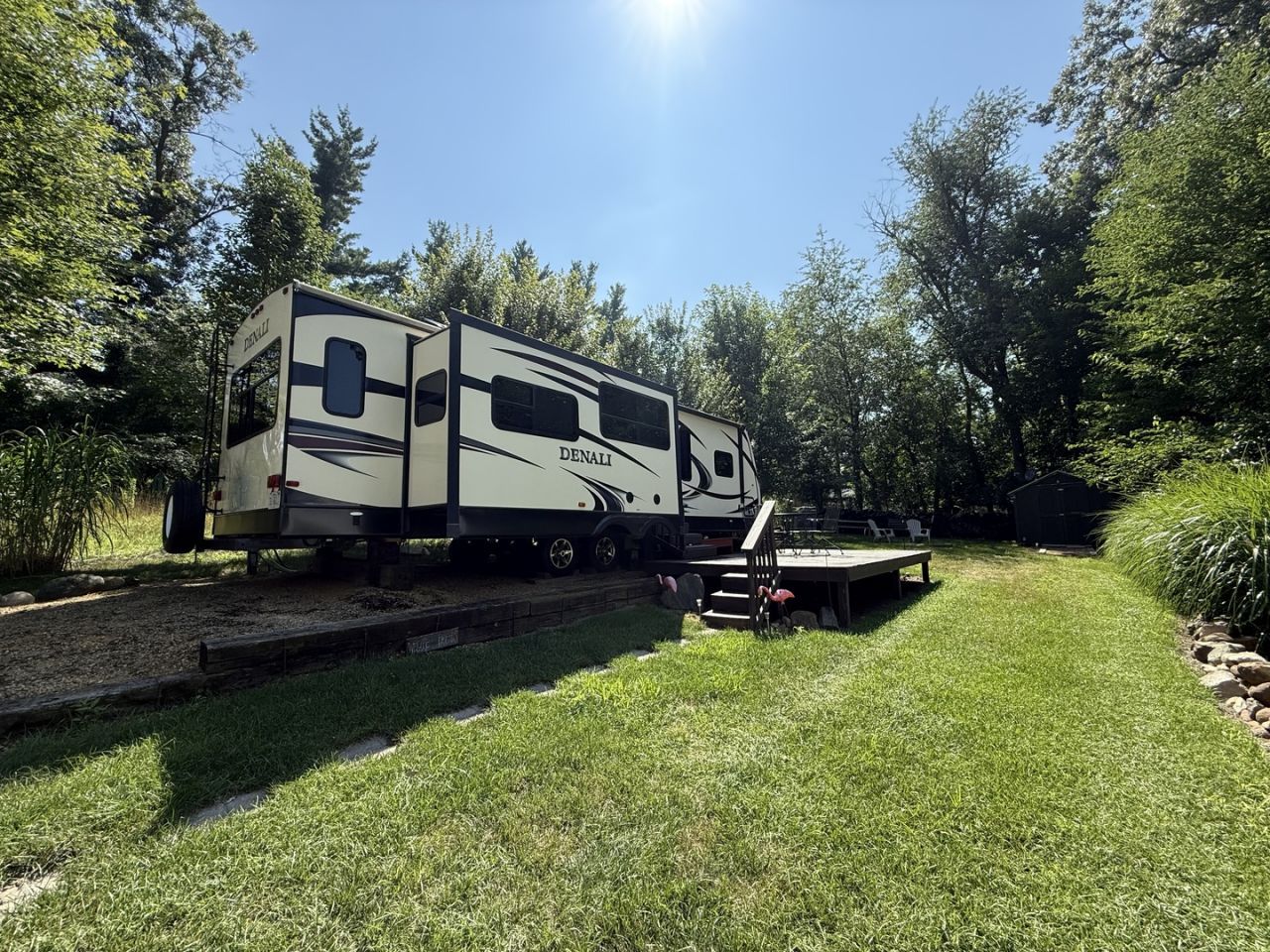 Don't miss this exceptional opportunity to own a well-maintained 2015 Dutchmen Denali 3255RL, a 32-foot travel trailer situated on a beautifully shaded, sewered lot along a cul-de-sac near Woodhaven Lake, Pool 2, the beach, and more. This lot borders common property, offering added privacy and space for outdoor enjoyment. The property features a spacious deck perfect for entertaining, complete with patio furniture, a fire pit with loads of firewood, and a 3-car gravel parking pad. The landscaped lot also includes a shed with electricity and shelving, a TV antenna and satellite dish, and planted vegetation that enhances the peaceful outdoor setting. Inside, the trailer boasts a thoughtfully designed layout with a central kitchen island, ample storage, a hutch, pantry, and appliances including an LP gas stove, microwave, and refrigerator. The living and dining area is warm and inviting, with an electric fireplace, two rocker recliners, a pullout couch, a dining table with four chairs, and a mounted TV. Down the hall, you'll find a full bathroom featuring a skylight above the standing shower, vanity, and hot water heater included. The master bedroom offers both comfort and functionality with a spacious wardrobe, TV, and direct access from either the hallway or the bathroom. All appliances, furnishings, curtains, drapes, rods, blinds, and light fixtures are included-just bring your personal items and settle in. With its thermal package, two LP tanks, smoke detectors, and cozy setup, this property is ready for immediate enjoyment. This travel trailer and lot combo offers everything you need, and comfortable living in a desirable location. Call today for a viewing! Please note that Woodhaven Lakes is a gated recreational community and cannot be used as a primary residence or homestead. You must be accompanied by a broker to view any properties, YOU CANNOT ACCESS THE CAMPGROUND WITHOUT A PASS. The property owner pays the association fees. **Seller will sell camper separate**