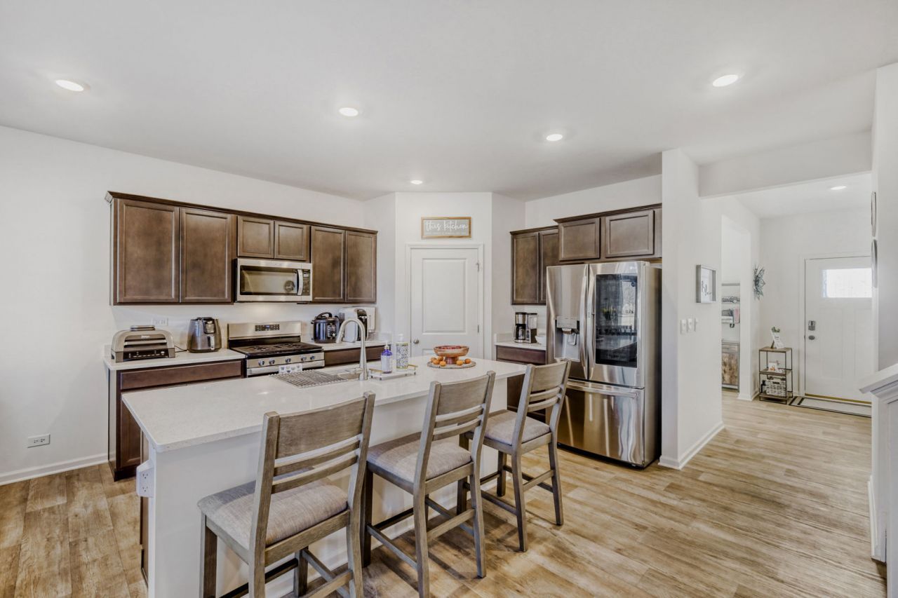 BETTER THAN NEW with a 3-CAR GARAGE on a PREMIUM CORNER LOT in the established Ashcroft Place community of Oswego! This stunning Henley model offers over 2,600 square feet of beautifully designed living space featuring 4 bedrooms, 2.5 bathrooms, and thoughtful upgrades throughout. A charming covered front porch welcomes you into a spacious foyer with a private den/office-perfect for working from home. The main level features 9-foot ceilings and an open-concept layout ideal for everyday living and entertaining. The gorgeous kitchen is the heart of the home, showcasing quartz countertops, a large center island, designer cabinetry, walk-in pantry, and upgraded LG stainless steel appliances including refrigerator, washer, and dryer. The rear of the home opens to a bright dining area and expansive great room, along with mud room next to the garage entrance, 1/2 bath and large walk in closet on main floor. Upstairs, the spacious primary suite features a private bath and an oversized walk-in closet. Three additional bedrooms, a full bathroom, a generous loft, and a large laundry room complete the second level. Step outside and enjoy the beautifully maintained corner lot with a newly built deck and patio-perfect for relaxing or entertaining outdoors. Additional highlights include smart home technology, security system with Blink cameras, professional landscaping, and move-in-ready condition with upgrades already completed. Why wait for new construction when this home offers more space, premium upgrades, and immediate availability?