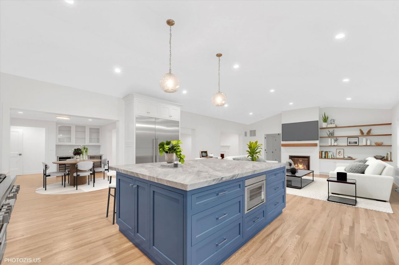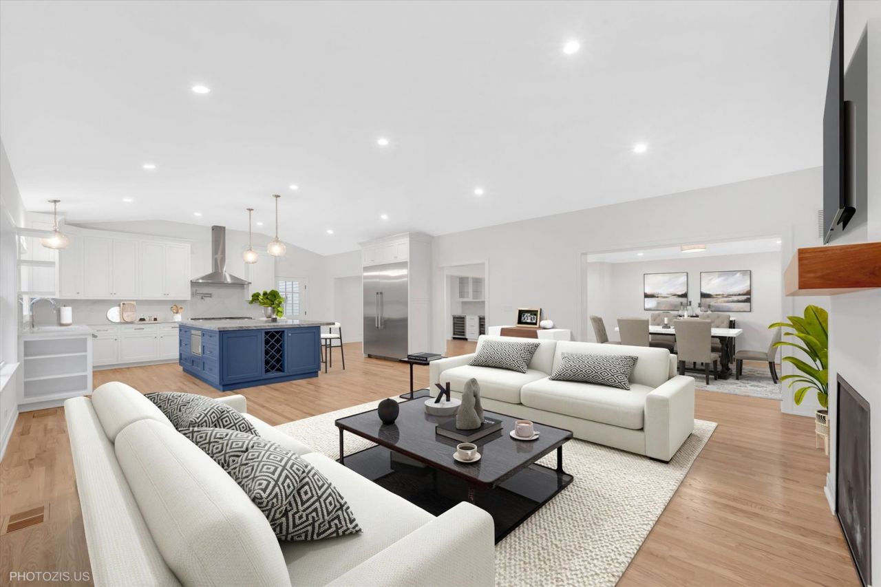 Stunning luxury home on one of Deerfield's premier streets, completely transformed and expanded with a sophisticated modern design. A dramatic addition introduces volume ceilings across the kitchen, family room, and main-level primary suite, creating open, light-filled living spaces. The designer kitchen features Thermador appliances, a 48 dual-fuel range, quartz counters, custom cabinetry, and a large island-seamlessly connected to the family room with fireplace and built-ins. A breakfast room, butler's pantry with beverage fridge, and elegant dining room with second fireplace enhance daily living and entertaining. The first-floor primary suite offers a spa-inspired bath with heated floors, soaking tub, oversized shower, dual vanities, and a fully outfitted walk-in closet. An attached office/nursery and a well-designed mudroom with laundry and storage complete the main level. Upstairs are four bedrooms and two new full baths. The redesigned lower level adds a recreation room with fireplace, wet bar, sixth bedroom, full bath, exercise room, and storage. Nearly everything is new, including Marvin windows, Hardie Board siding, roof, gutters, portico, 25' patio, and all mechanicals, plumbing, including piping, and electrical systems (plus the 1500+sq. ft. addition). Located in the Kipling and Shepard school districts, this home blends luxury finishes, timeless curb appeal, and exceptional functionality.